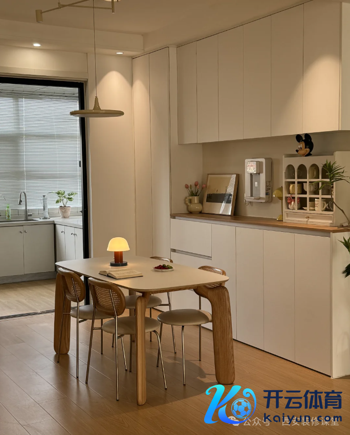 餐厅靠墙打了一转柜子,普通收纳一些杂物,放了1.6m的餐桌