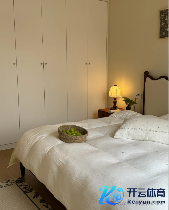 主卧奶油中古风,把重荷的窗帘换了,把布景墙换成和蔼的奶油色,换上颜面的床品,浅易嘱咐就很颜面~