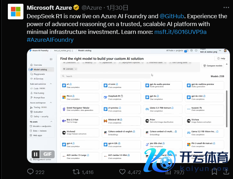 微软晓喻将DeepSeek-R1部署在自家的云职业Azure上。酬酢平台